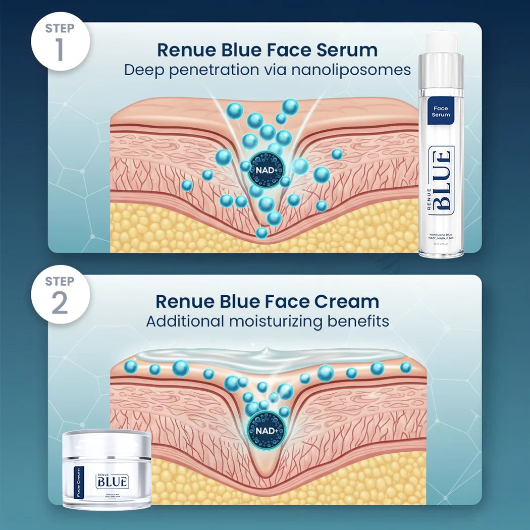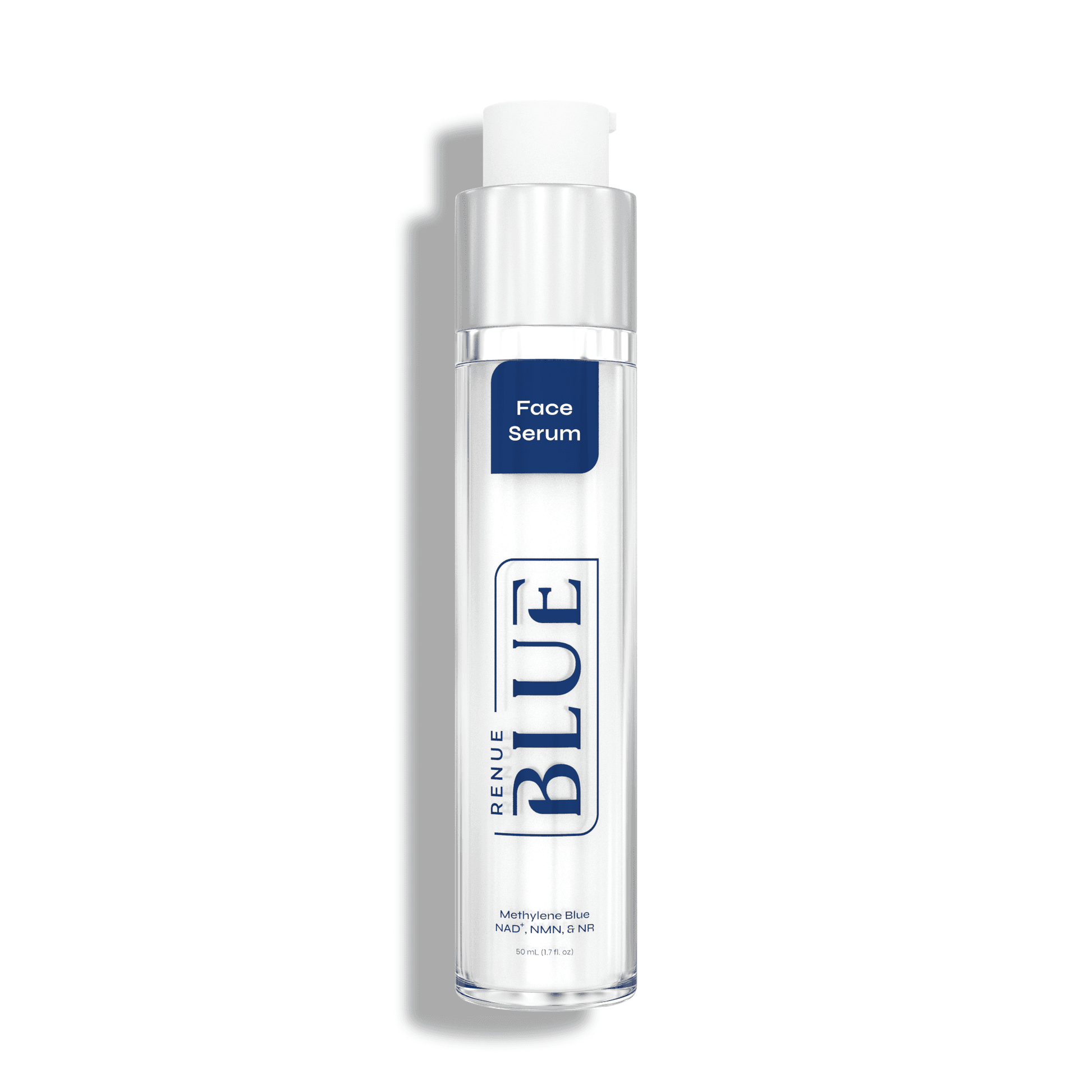 Renue Blue Face Serum formula has FOUR TIMES the amount of Methylene Blue, along with liposomal NAD+, NMN, NR, Apocynin, Glutathione and ALA.
