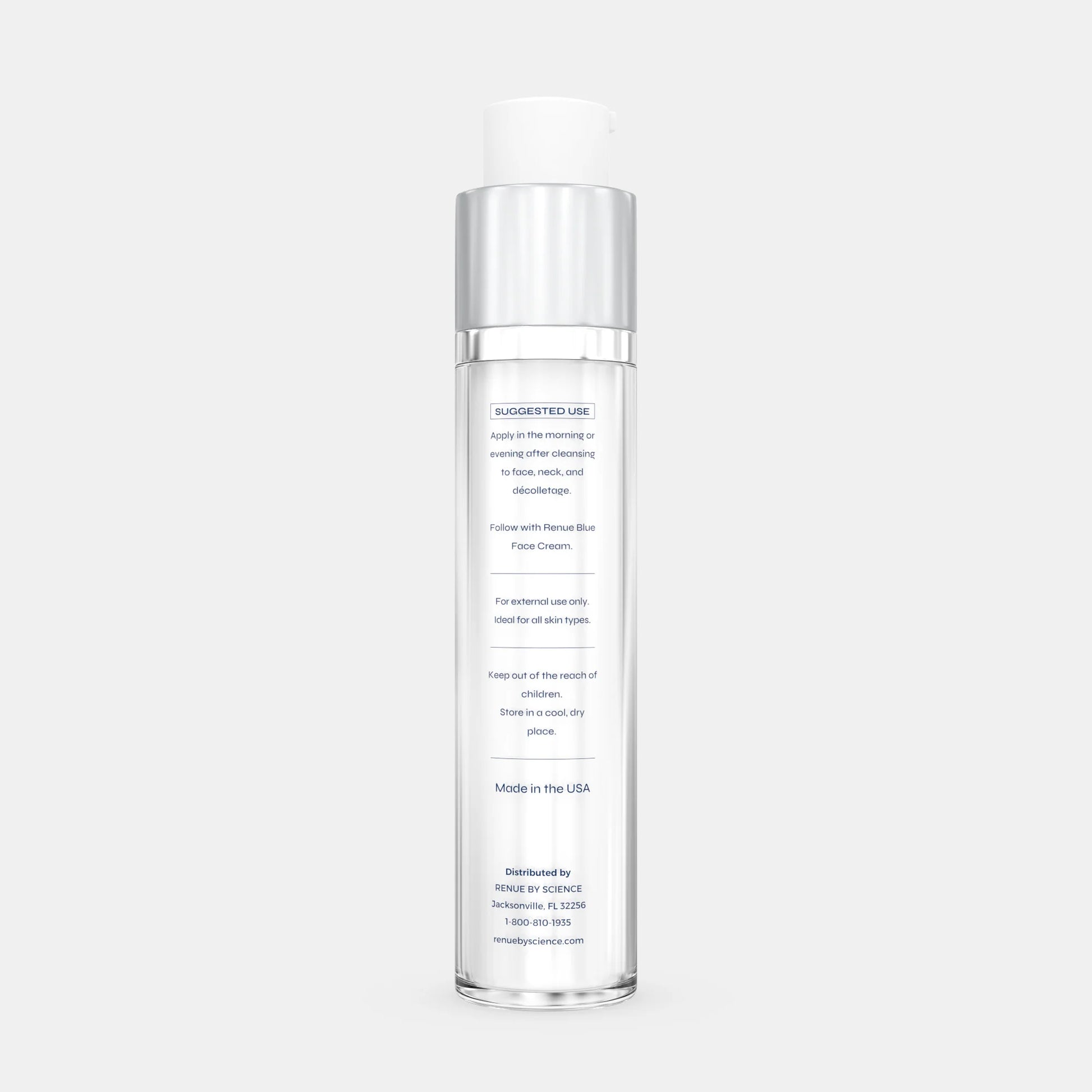 After cleansing skin apply one to two pumps of the serum to face, neck, decolette and hands. For extra moisturizing, follow with the Renue Blue™ Face Cream.