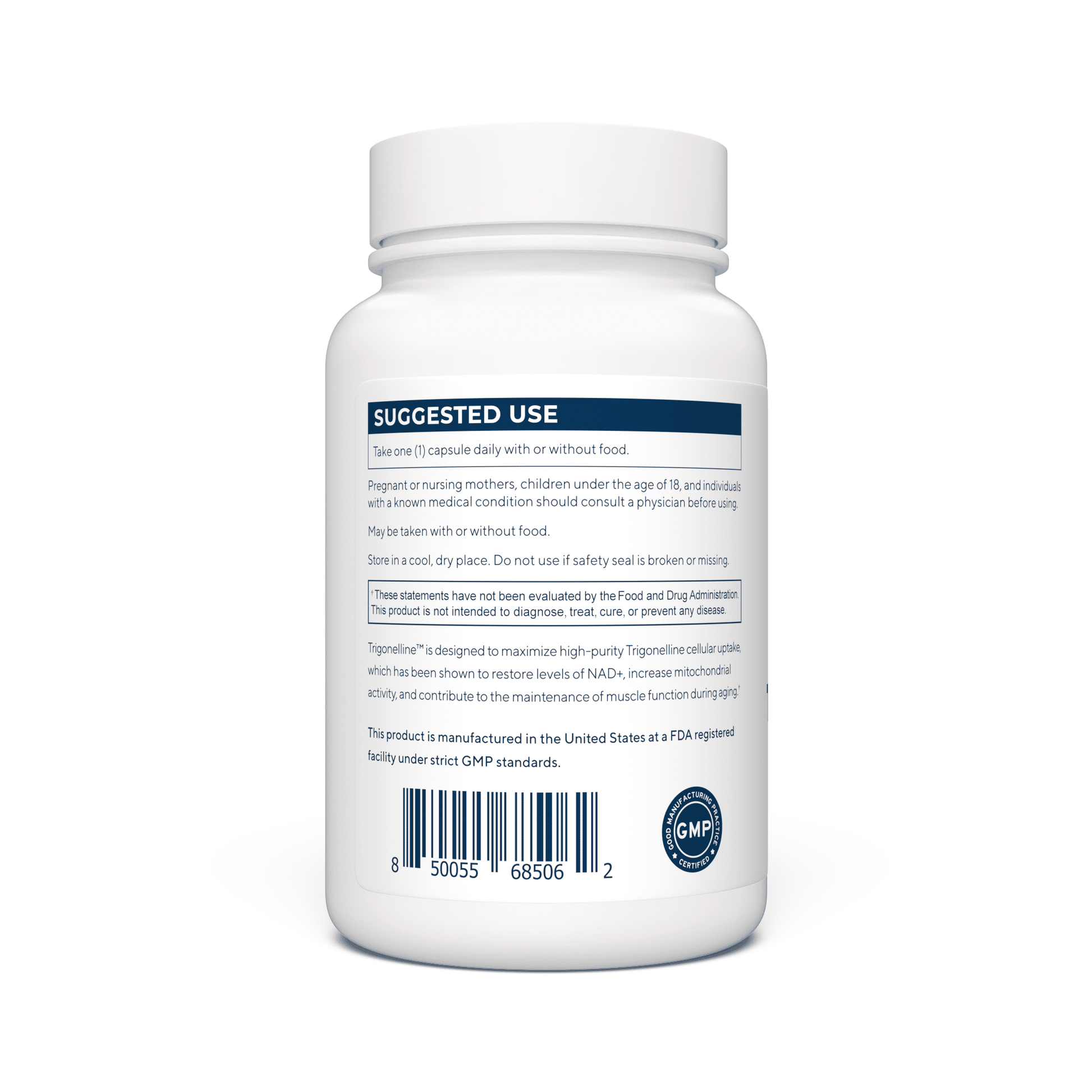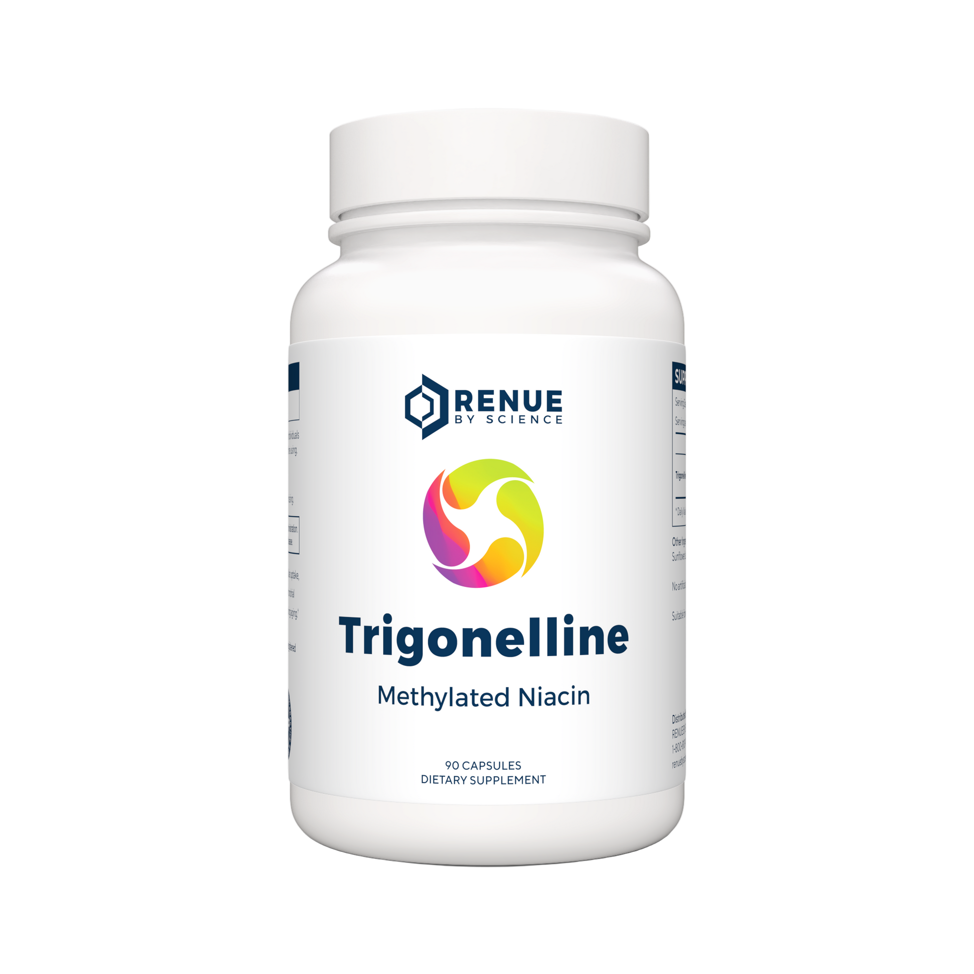 Trigonelline promotes cellular NAD+ production differently than NMN or NR. This methylated form of niacin offers several advantages: exceptional stability in the bloodstream, slow release into target tissues, non-flushing, protection against stomach digestion, and direct NAD+ increase in muscle tissues.